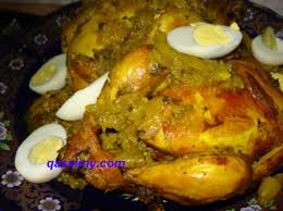 عند التقديم نصب المرق فوق الدجاج و نزينه باللوز المقلي و انصاف البيض المسلوق